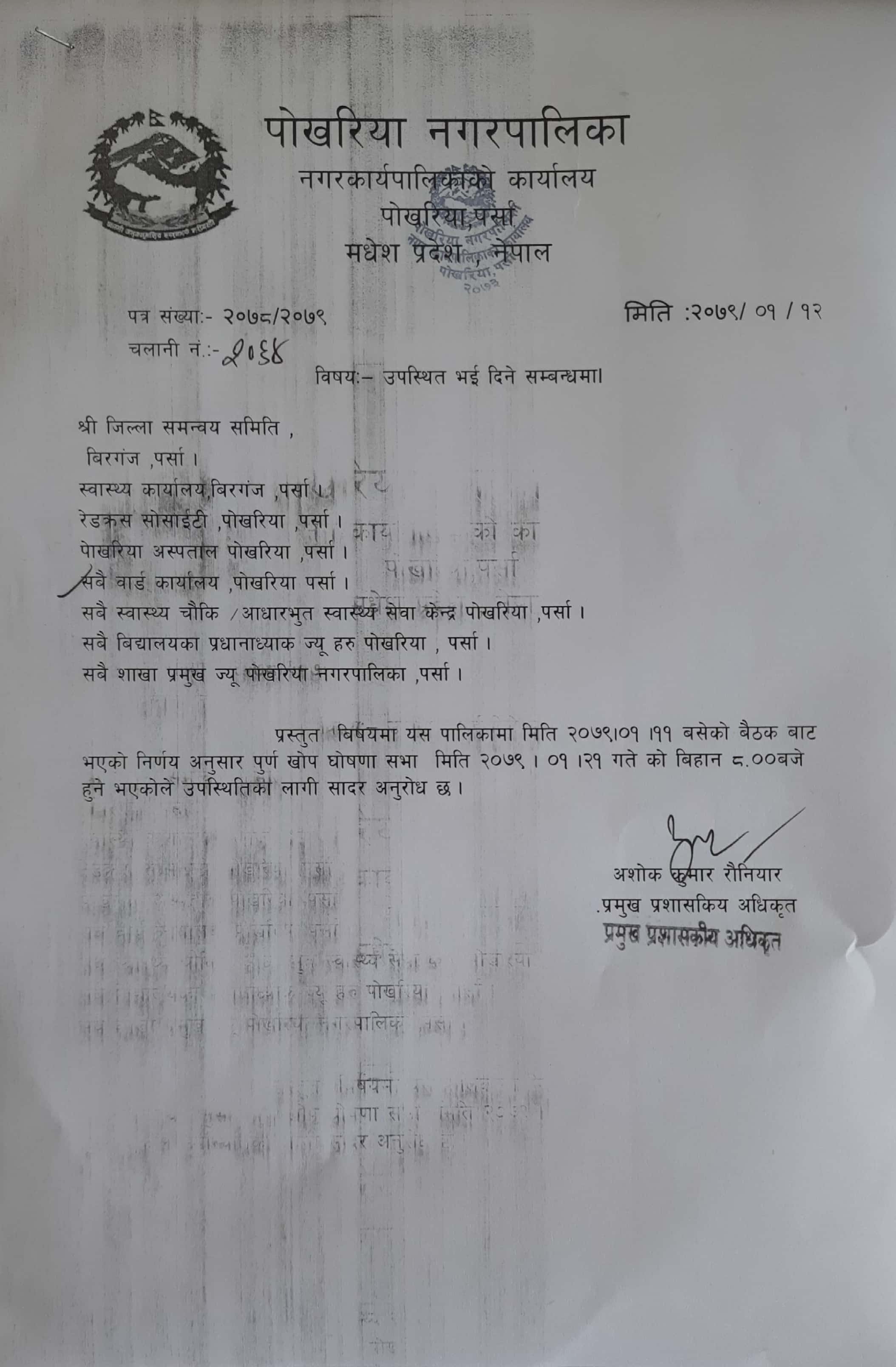 श्री सम्पूर्ण कर्मचारीहरु पोखरिया नगरपालिका, पर्सा ।